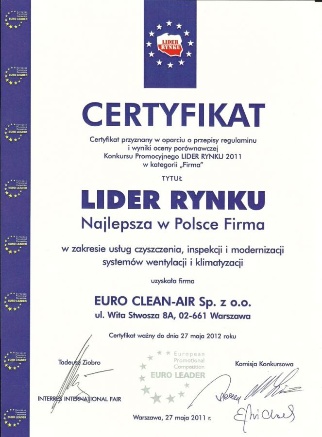 Z ogromną radością informujemy , że w dniu 27 maja br. Roku w Sali balowej Hotelu Sheraton podczas uroczystego rozdania nagród „Lider Rynku 2011” nasza firma została uhonorowana tym zaszczytnym tytułem w kategorii „Najlepsza w Polsce Firma – w zakresie usług czyszczenia, inspekcji i modernizacji systemów wentylacji i klimatyzacji".