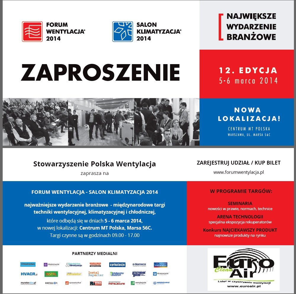 Mamy zaszczyt poinformować, że podczas najbliższej edycji Forum Wentylacja Salon Klimatyzacja 2014, po raz kolejny będziemy mieli okazję zaprezentować naszym klientom szereg usług oraz produktów znajdujących się w ofercie naszej firmy.